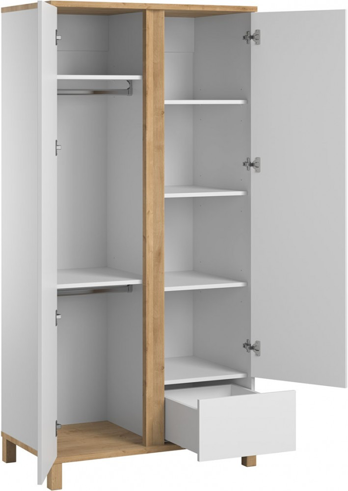 A szekrény bal oldalán 2 polc található, alatta ruhaakasztóval.