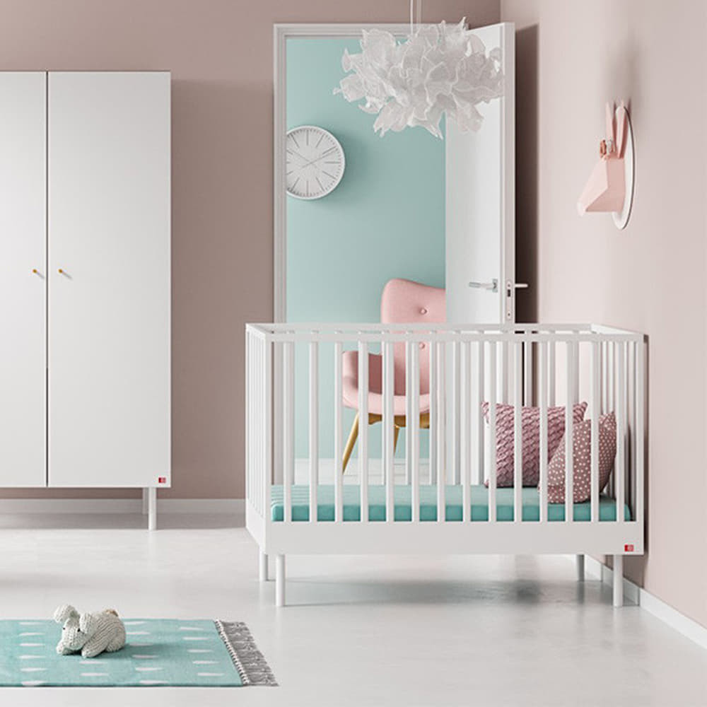 60x120-as ágy az Cute bútorcsaládból 3 fokozatban állítható fa alappal, fehér színű fém lábakkal, hogy egy kis modernitást vigyen a babaszobába.
