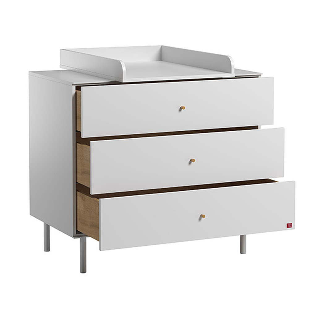 A fiókok lekerekített fa fogantyúkkal és csendes záródású rendszerrel is rendelkeznek. Opcionálisan egy pelenkázó toldaék is rendelkezésre áll, amellyel a komódot pelenkázó hellyé alakíthatja a baba első hónapjaiban.