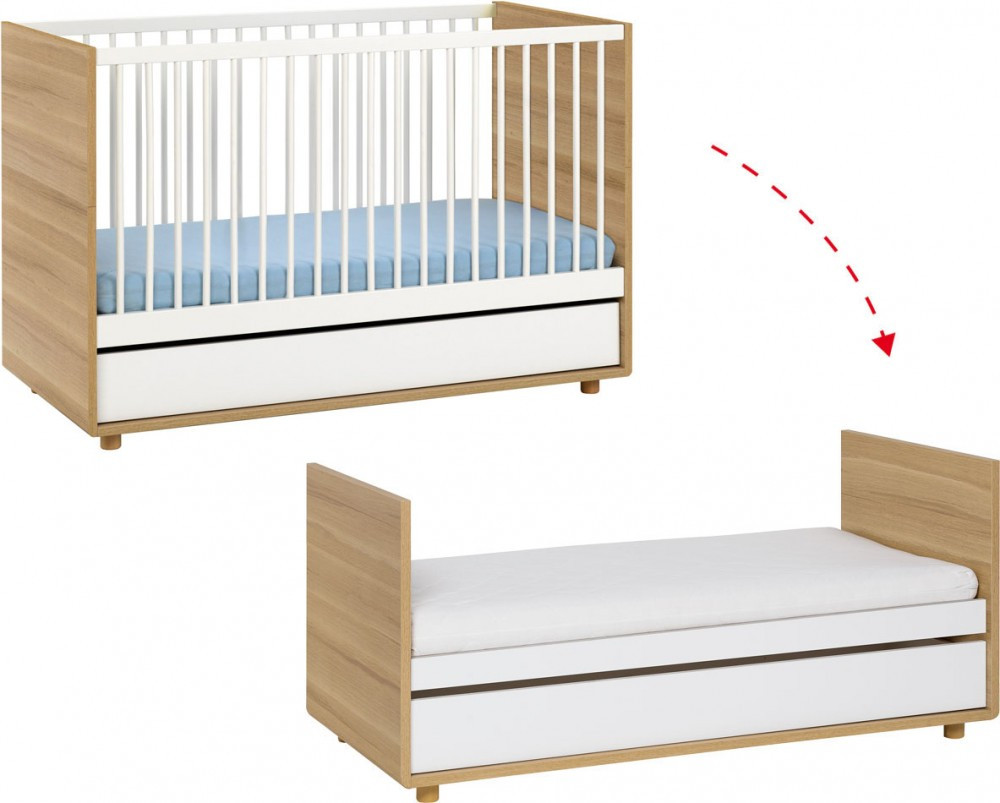 - 3 kivehető léc, amely később megkönnyíti a baba önálló ki-be járását a leeresztett kiságyb