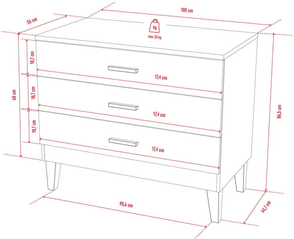 A tágas, három fiókos komódban minden gyermekruha és ápolási kellék elfér.