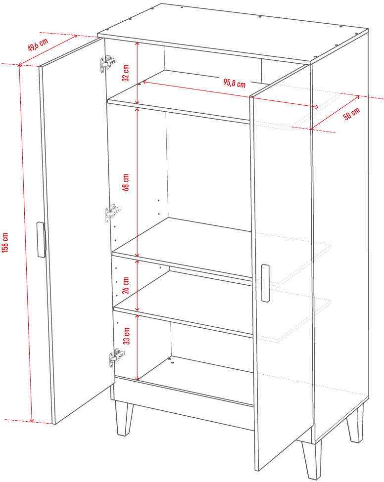 Az ajtókat kinyitva a szekrény belső elosztású polcos szerkezetű, melyek praktikus kihasználhatóságot biztosítanak.