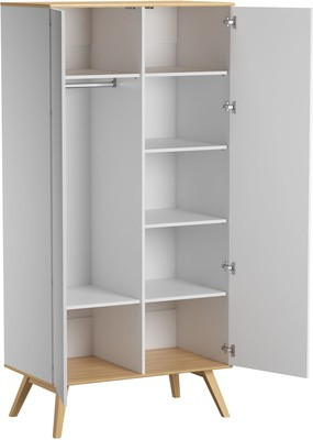 A gardrób bal oldalán, felül a ruhaakasztós polc, alul pedig egy állítható magasságú polc található.