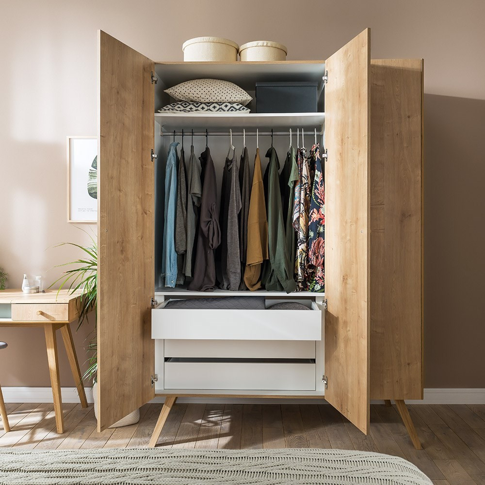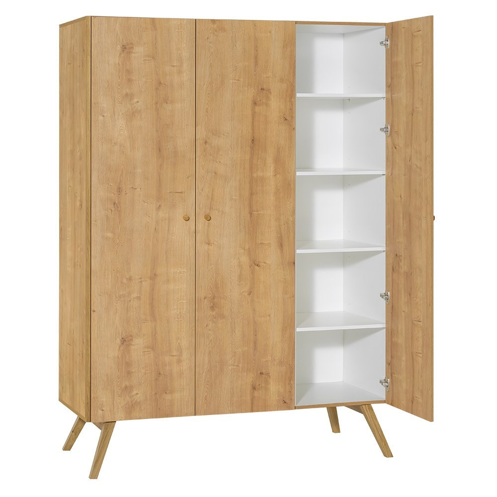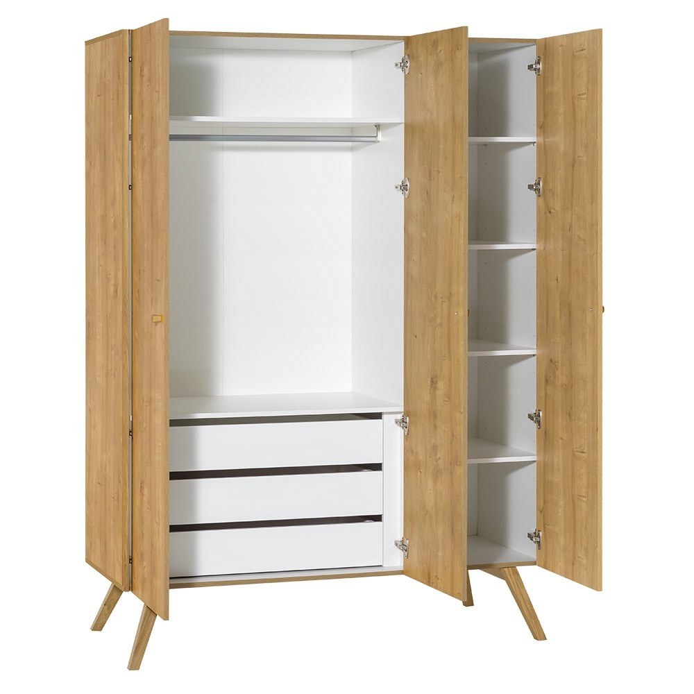 A Vox Nature 3 ajtós gardróbja rengeteg tárhelyet kínál, így nem lesz gond a ruhák rendben tartásával. Az egyszerű dizájn és a letisztult vonalak egy csipetnyi skandináv stílust kölcsönöznek, bárhol is helyezik el, minden belső stílushoz biztosan illeszkedik! A akasztós helynek, a polcoknak és a fiókoknak köszönhetően ruhái tökéletesen rendeződnek. A fogantyúk és a lábak tömör tölgyfából készültek. Az ajtók lágy zárás funkcióval rendelkeznek. A bal oldalon akasztósín, felül egy polc és alul 3 fiók található. A jobb oldalon egy függesztősín és 4 állítható magasságú polc kapott helyet.