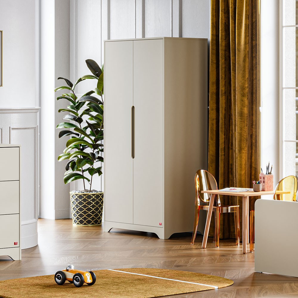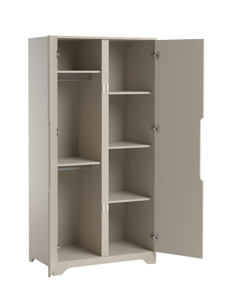 A VOX Ova a modern egyszerűség, funkcionalitás és minőség megtestesítője. A két ajtós gardrób rengeteg praktikus tárolóhelyet biztosít gyermeke holmijai számára. A szekrény egyik oldalán polcok vannak az összehajtogatott ruhák és egyéb szükséges dolgok számára, a másik oldalon pedig nagyon átgondoltan két függő sín. A maratott foganytúk amellett hogy igazán praktikusak, letisztultságot is tükröznek.