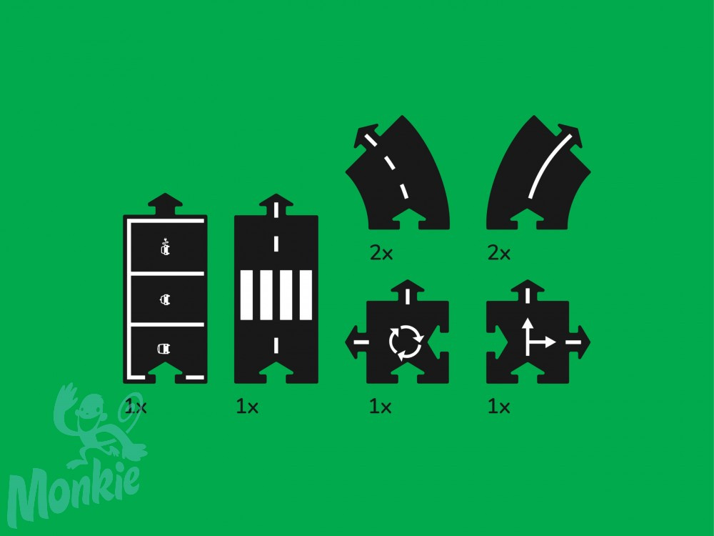 Tartalma: 4 db kanyar, 2 db egyenes (gyalogos átkelő és parkoló), 2 db kereszteződés