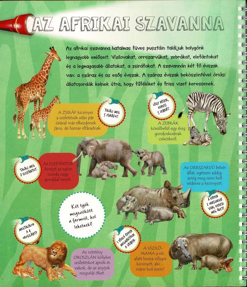 Szuper időtöltés a felfedezés! Használd a kötethez a mellékelt karton zseblámpát, és fedezd fel az állatkölyköket! Vadállatok vagy házi kedvencek, kicsik és nagyok, szelídek vagy veszélyesek - mind megbújnak a sötétben, keresd meg őket!