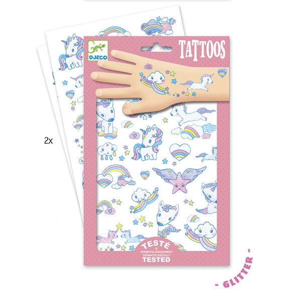 A gyerekek körében nagyon kedvelt unikornisz és pónifigurák tetováló matrica kivitelben is nagy örömet okozhatnak! A gyerekek nagy örömére rózsaszín csillámporral vannak megszórva! Könnyen használható, előre kivágott és kevés vízzel felhordható ideiglenes tetováló matricák. Bőrgyógyászatilag tesztelt.