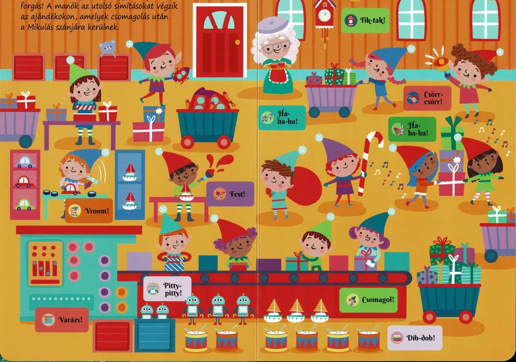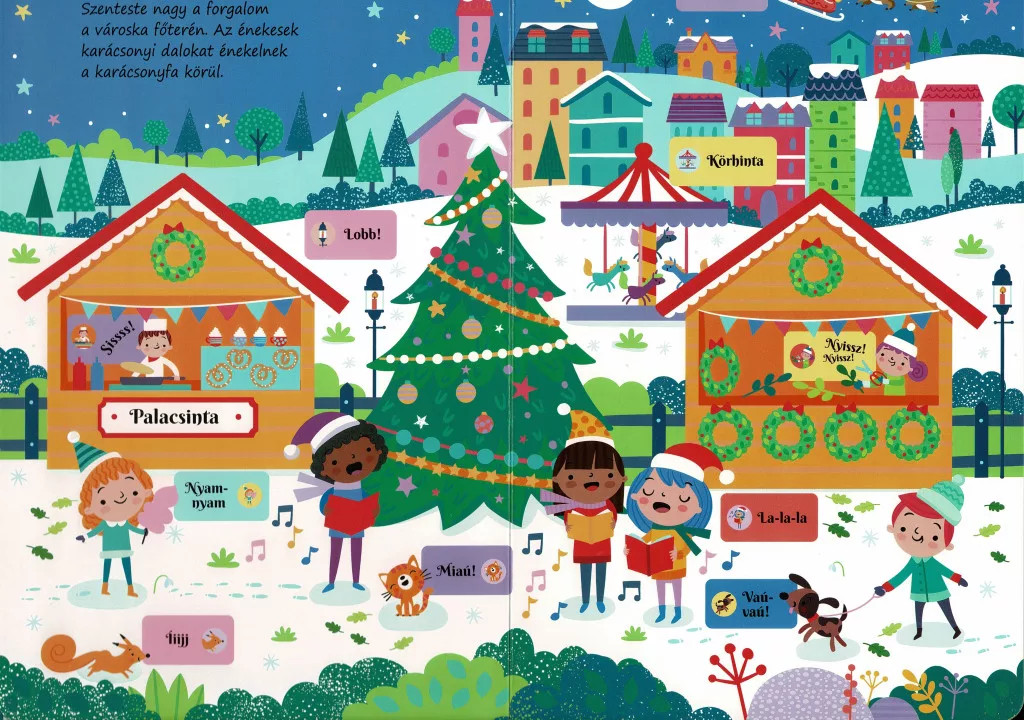 A "Böngéssz karácsonyi hangokat!" egy különleges könyv, amely elrepít a karácsony varázslatos világába. A könyv lapjain megelevenednek a városka ünnepi zsongása, a Mikulás műhelyének sürgés-forgása, a rénszarvasok pajtájának vidám zaja, és még sok más karácsonyi csoda. A hangmodulok segítségével minden jelenet valódi hangulatot teremt, legyen szó a csilingelő szánról vagy a gyerekek nevetéséről.
