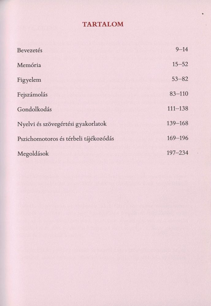 Miért kellene lemondanunk a szellemi frissességről? Az évek múlnak, de napi pár perc aktív agytornával elkerülhetjük a feledékenységet, a romló memória okozta kellemetlenségeket. Ebben a könyvben 150 feladat vár bennünket, amelyek segítenek az emlékezet, a figyelem, a pszichomotoros képességek vagy a tér-idő érzékelés fejlesztésében, frissen tartásában. Már napi néhány feladat elvégzése is érzékelhető változást okozhat. Agytornára fel!