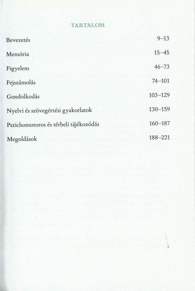 Miért kellene lemondanunk a szellemi frissességről? Az évek múlnak, de napi pár perc aktív agytornával elkerülhetjük a feledékenységet, a romló memória okozta kellemetlenségeket. Ebben a könyvben 150 feladat vár bennünket, amelyek segítenek az emlékezet, a figyelem, a pszichomotoros képességek vagy a tér-idő érzékelés fejlesztésében, frissen tartásában. Már napi néhány feladat elvégzése is érzékelhető változást okozhat. Agytornára fel!