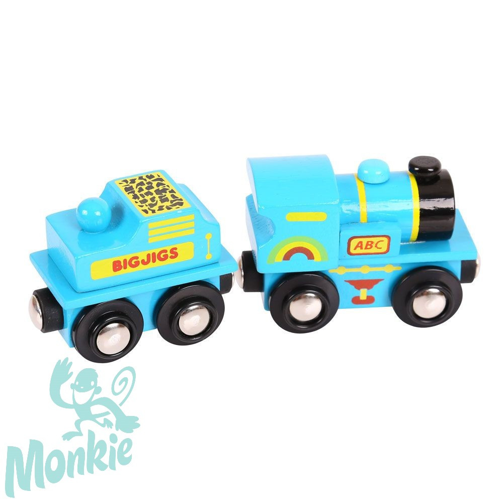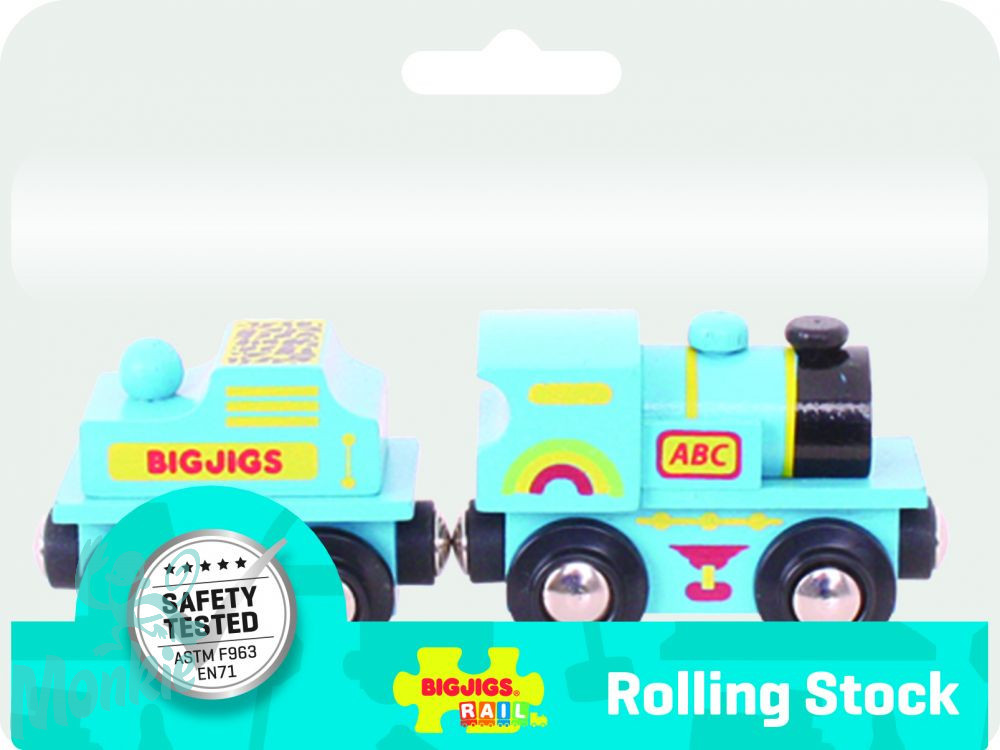 Ez a kék mozdony egy "ABC" feliratú vagonnal rendelkezik. A mágneses kapcsok lehetővé teszik, hogy a többi elemmel összekapcsolható legyen. 2 darabból áll. A legtöbb fából készült útszerkezet játékok összekapcsolhatóak a Bigjigs vasúttal. Jó minőségű, nagy felelőséggel kiválasztott alapanyagokból készült. A jelenlegi európai biztonsági előírásoknak megfelel.